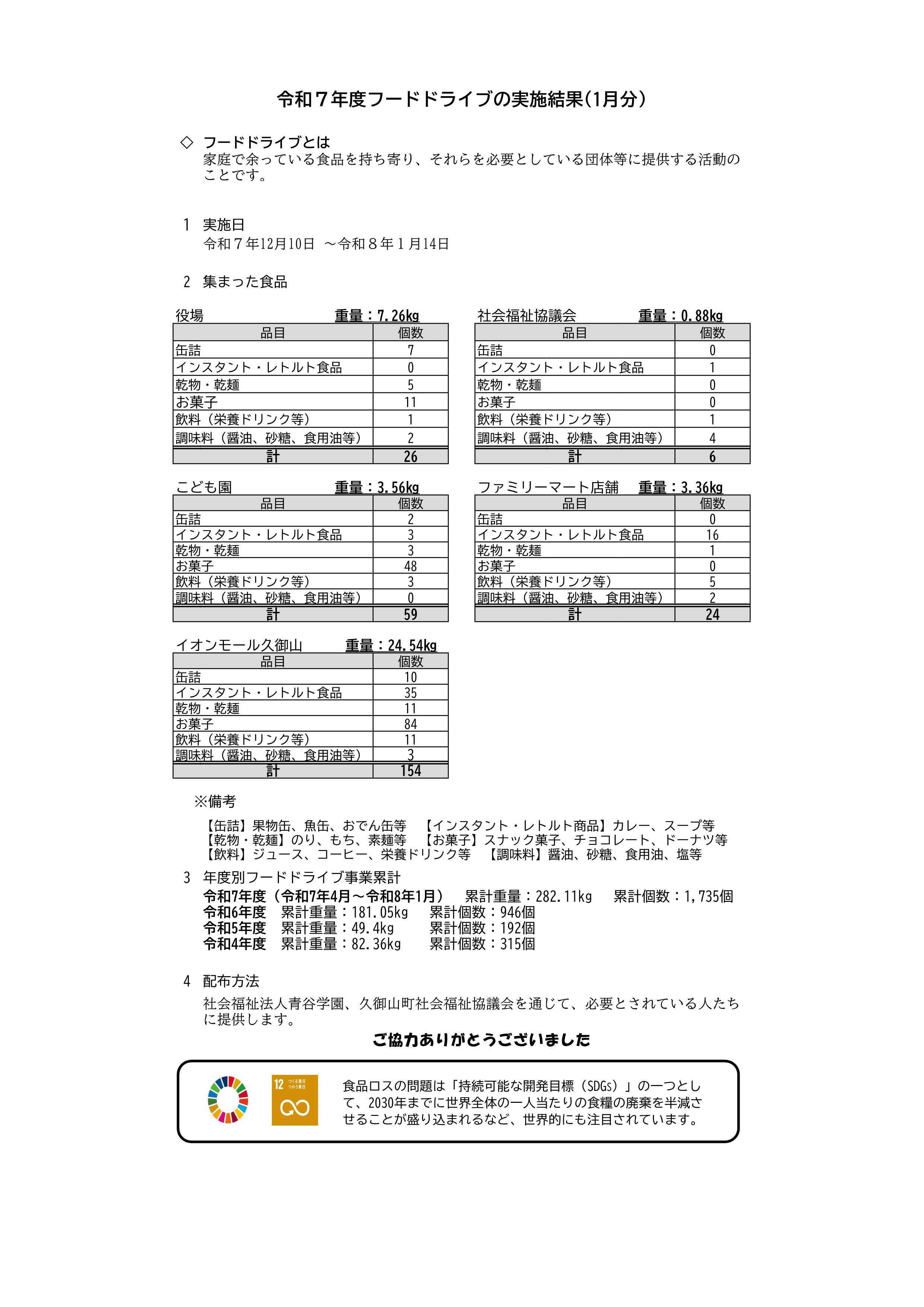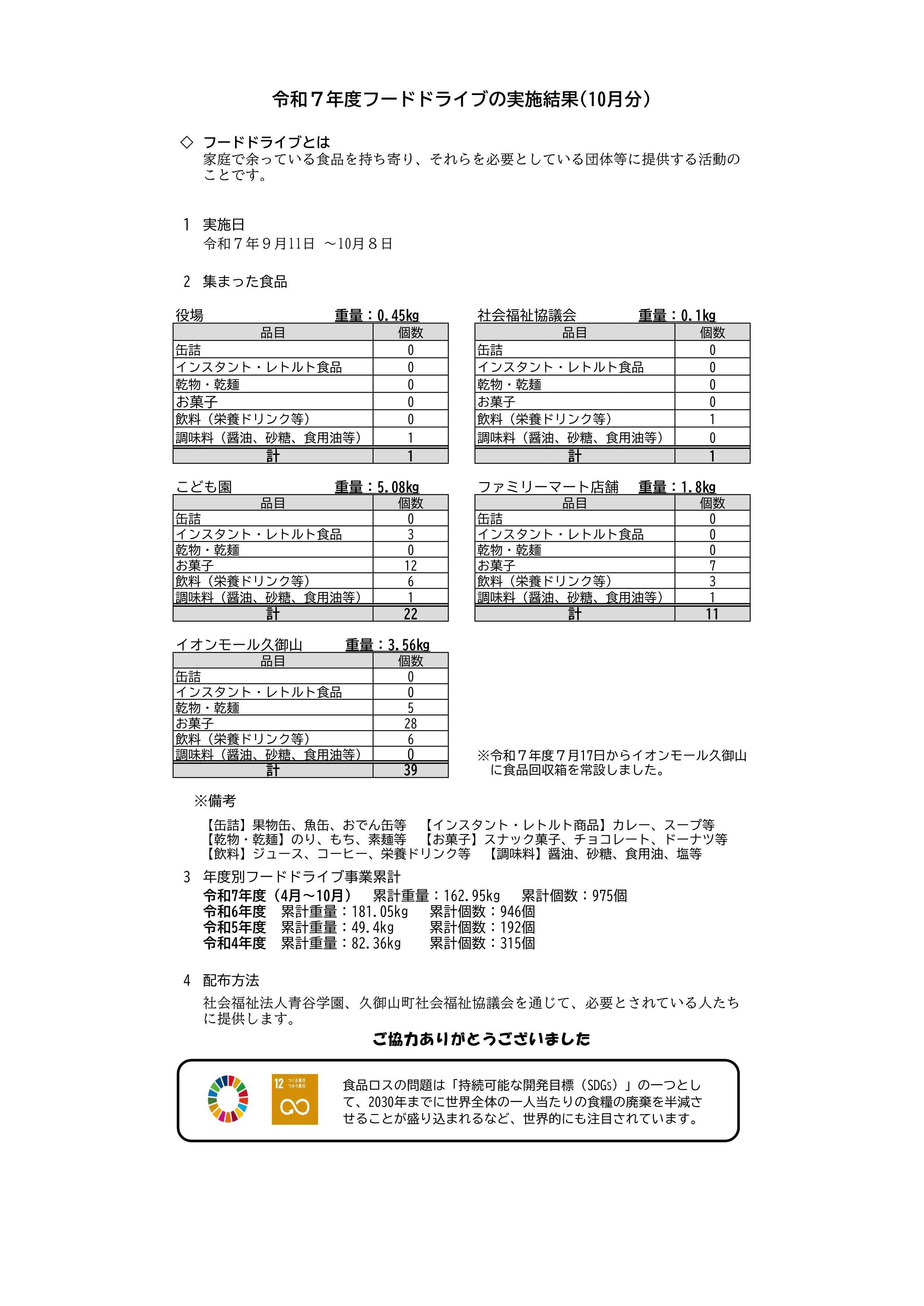 ※フードドライブとは・・・ご家庭や企業などで余っている未開封のもので、常温で保存でき、賞味期限が一定期間(概ね1か月~2か月)以上残っている食品を持ち寄り、必要としている方々に提供する活動で、食品ロス削減につながる大切な取組です。