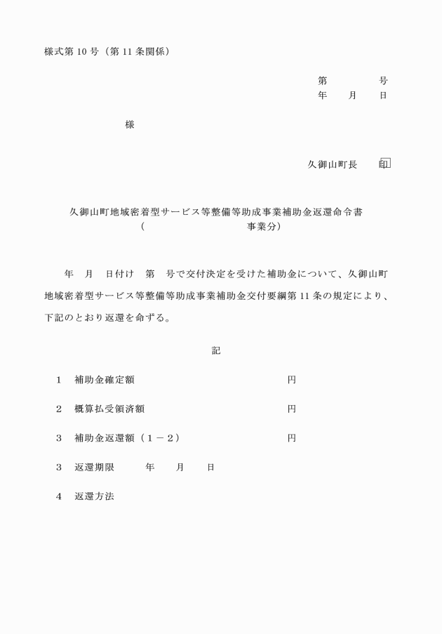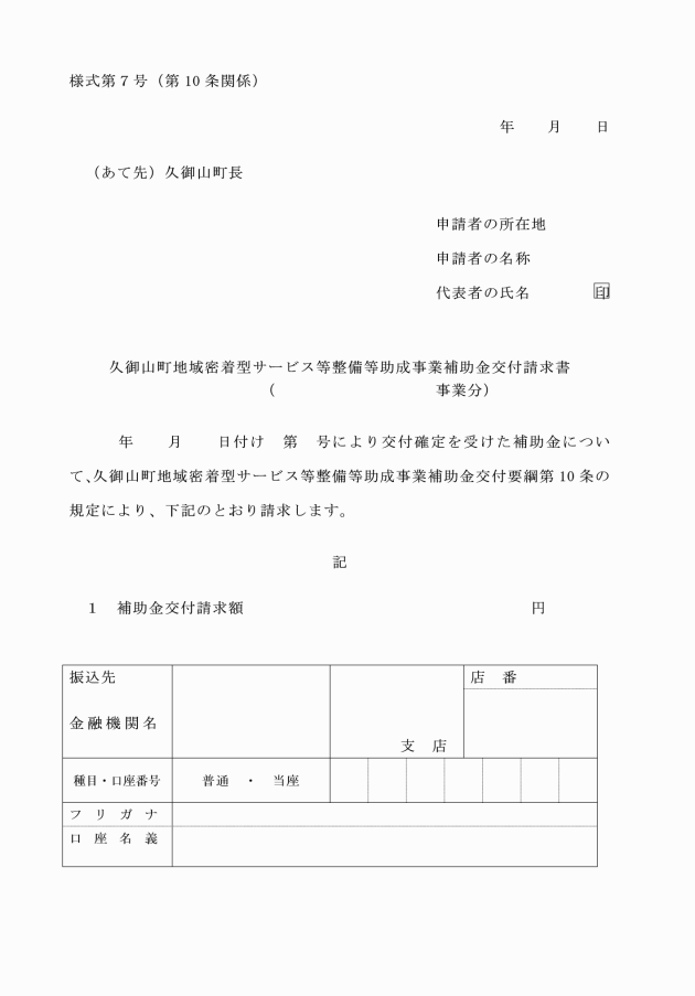 第4条 補助金の交付を受けようとする者は、久御山町地域密着型サービス等整備等助成事業補助金交付申請書(様式第1号)に事業計画書及び収支予算書その他関係書類を添えて、町長に申請しなければならない。